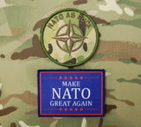 - woven MAKE NATO GREAT AGAIN patch. Measures 3.5" x 2.5" with hook & loop Velcro backing
