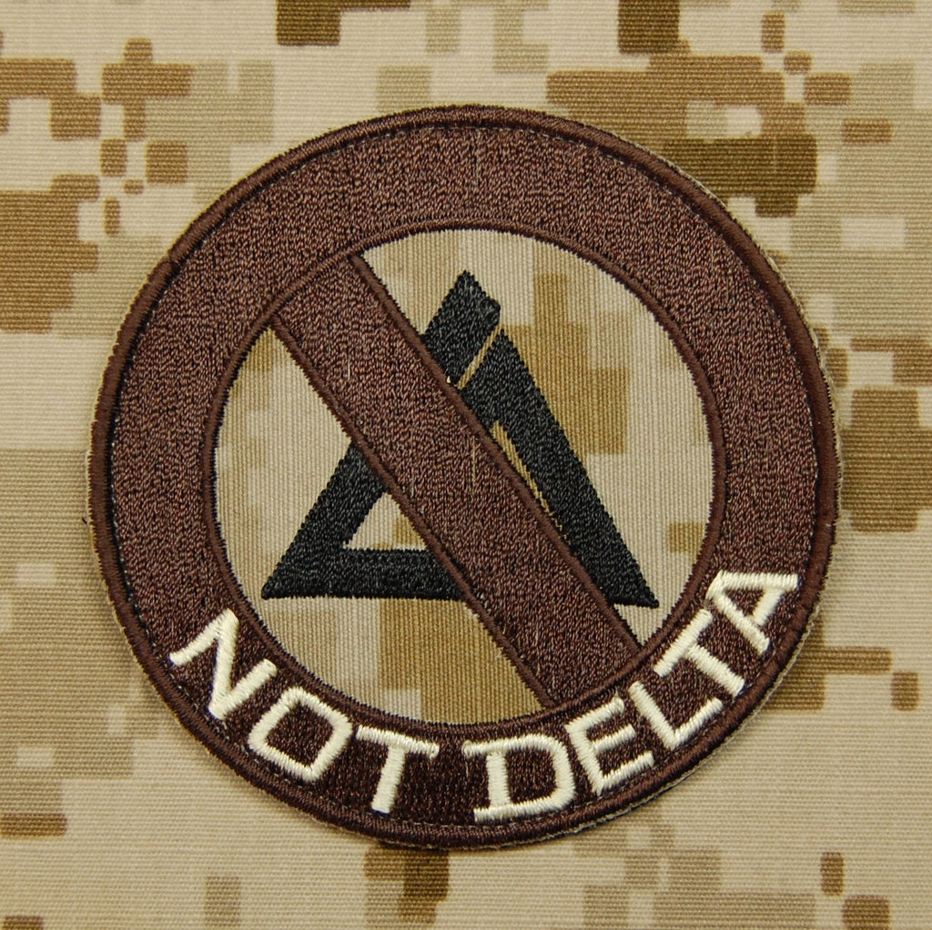 Embroidered NOT DELTA morale patch on genuine AOR1 fabric with VELCRO® Brand hook fastener backing.  Measures 3" in diameter.