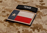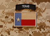 Embroidered Subdued Texas State Flag Patch and Texas tab. The patch measures 3" x 2" / 7cm x 5cm and the tab is 2.5" x 0.70" / 6.3cm x 1.5 cm. Both are Velcro-backed.