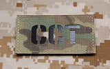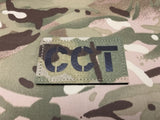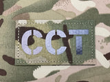 CCT call sign patch made from a layer of laser cut Multicam 500D Cordura over a layer of 3M black IR material. The patch measures 3.5" x 2" / 90mm x 50m with Velcro-backing.