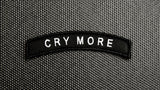 Embroidered CRY MORE tab morale patch set. Includes 1 x Multicam color way and 1 x Black & White color way. Patches measure approximately 4" x 0.75" with hook & loop fastener backing.