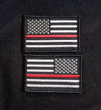 Embroidered 'Thin Red Line' US Flag patch set. Includes forward and rear-facing flags. Each patch measures 3" x 2" with hook Velcro-backing.