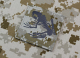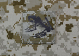 NWU II Frog Skeleton morale patch. The size of the patch is 3" x 3" and features a layer of laser cut AOR1/NWU III 330D Cordura over a layer of 3M black IR material with VELCRO® Brand hook backing.