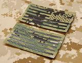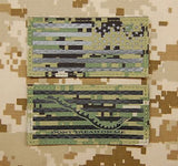 Infrared reverse US flag & First Navy Jack on a layer of laser cut NWU Type III / AOR2 330D Cordura over a layer of 3M black IR material. Each patch measures 4" x 2" and has hook Velcro backing.