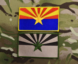 Embroidered large Arizona state flag set: includes 1 full color AZ flag and 1 subdued AZ flag in Multicam color scheme. Measures 3" x 5" with hook & loop Velcro backing.